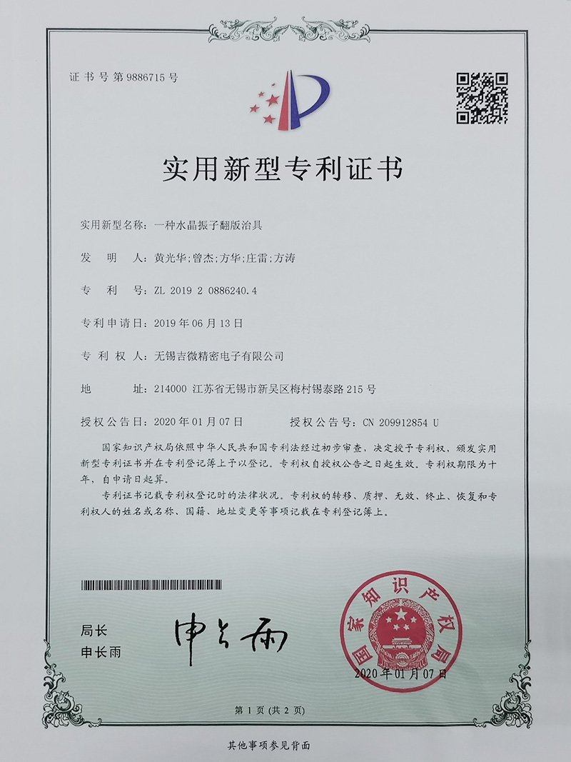 一種水晶振子翻版冶具實(shí)用新型專利證書