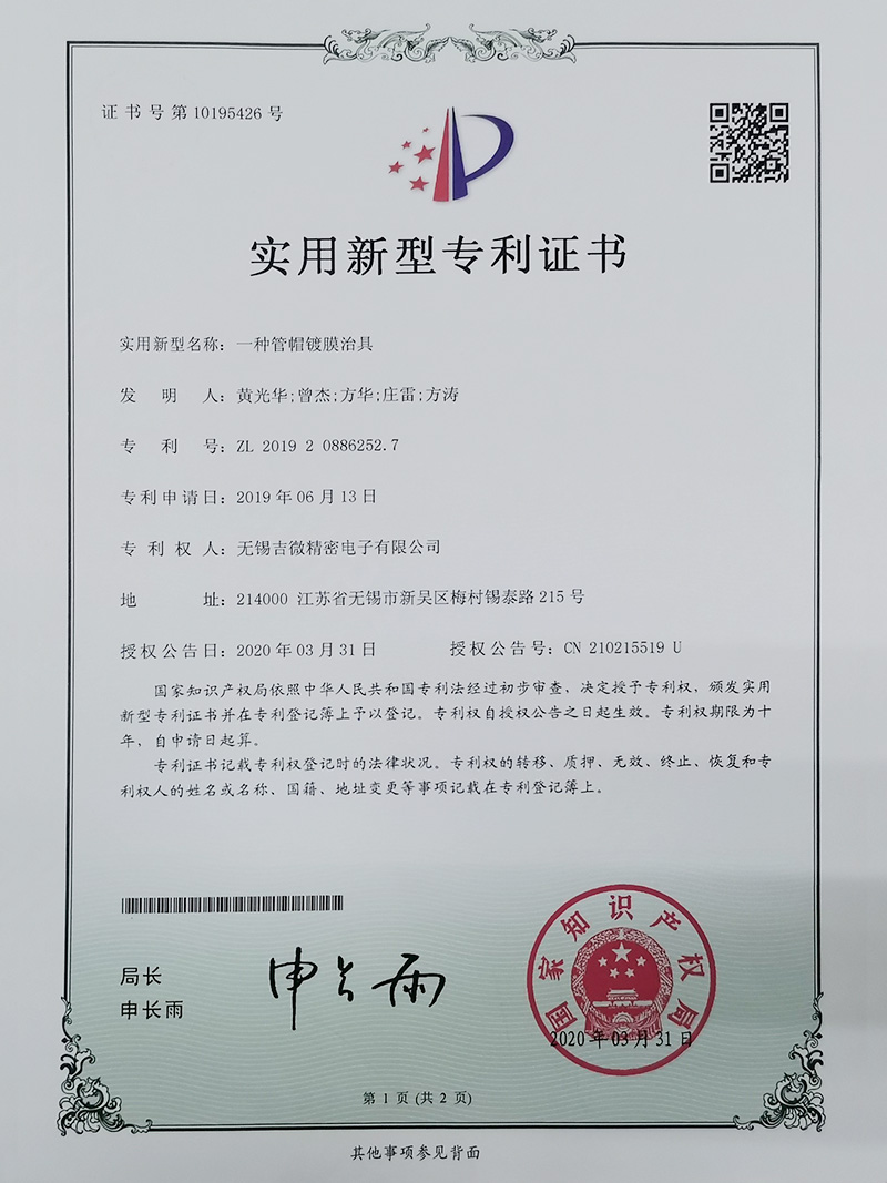 一種管帽鍍膜治具實(shí)用新型專利證書(shū)